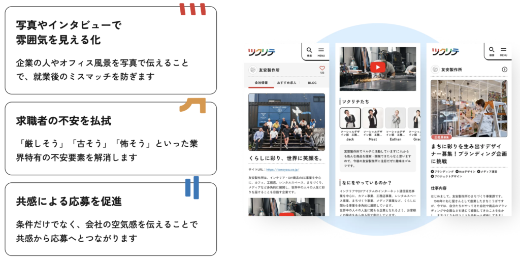 - 「共感」で選べる求人:給与・条件だけでなく、ミッションや働く人のストーリー、現場の雰囲気が分かる構成。価値観の合う会社に出会えます。